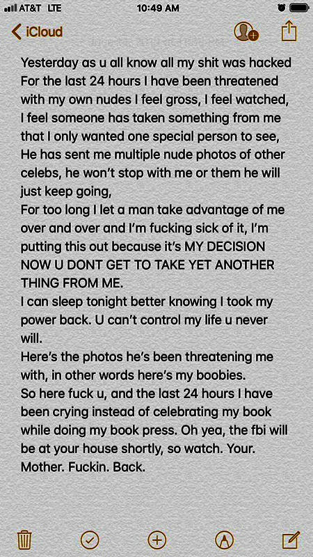 Una imagen adjunta a las otras precisaba lo que estaba ocurriendo: “Ayer como todos ustedes saben, toda mi mierda fue hackeada. Durante las últimas 24 horas me han amenazado con mis propios desnudos. Me siento asqueroso, me siento vigilado, siento que alguien me ha quitado algo que solo quería que viera una persona especial. Me ha enviado varias fotos de desnudos de otras celebridades, no se detendrá conmigo ni con ellas, simplemente seguirá.