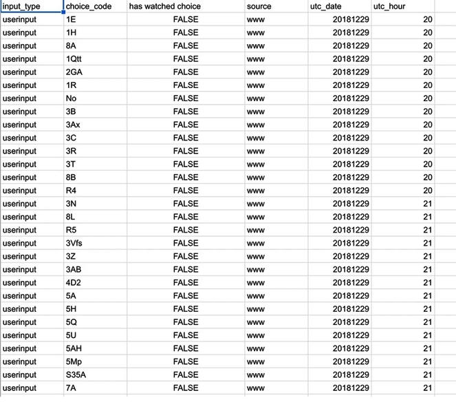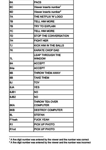 También almacena formas agregadas de la opción de los usuarios para "ayudar a [Netflix] a determinar cómo mejorar este modelo de narración en el contexto de un programa o película", dijo la compañía en su respuesta por correo electrónico. Los archivos .csv y PDF muestran el viaje de Veale a través de Bandersnatch, cada opción se muestra en una larga fila para que él la vea.