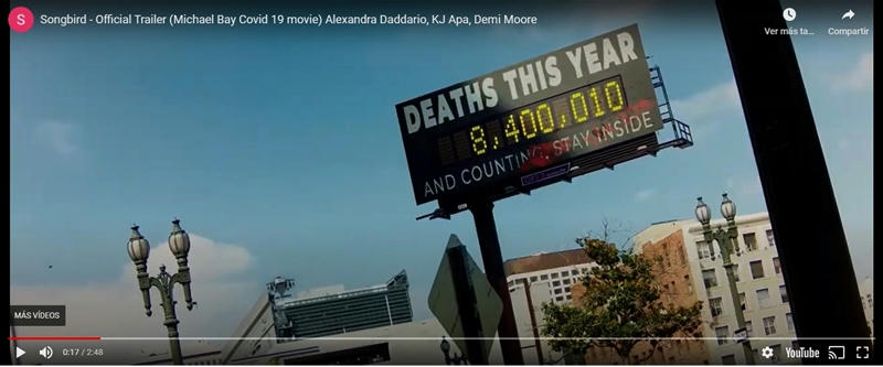 Ahora bien, para ser justos Songbird no es la única película sobre la pandemia de Covid-19. El primer film en abordar la temática de la pandemia es Corona: Fear is a Virus, escrita y dirigida por Mostafa Keshvari, la cual fue rodada en plena pandemia y se ideó incluso antes de que la OMS decretara la alarma mundial por la enfermedad.
