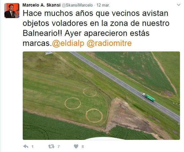 El primero en avisar del enigmático incidente fue el Intendente de Areco, Marcelo A. Skansi, y lo hizo vía Twitter. En el primero de sus mensajes, el intendente posteó una foto aérea del Aeroclub, donde se observaban los tres círculos, acompañada de un críptico mensaje compartido a algunos medios locales: “Hace muchos años que vecinos avistan objetos voladores en la zona de nuestro Balneario!! Ayer aparecieron estás marcas”.