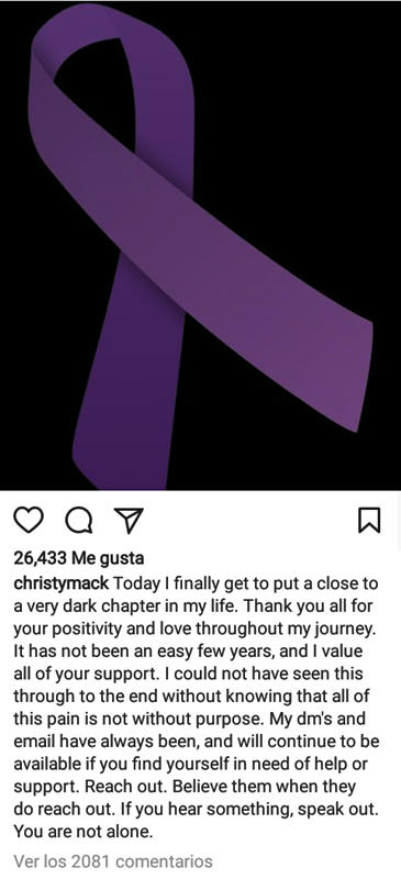 Mack, también dijo en Instagram que 'Gracias a todos por su positivismo y amor a lo largo de mi viaje. No han sido unos años fáciles y valoro todo su apoyo. No podría haber visto esto hasta el final sin la certeza que todo este dolor no tendría un propósito”, ('Thank you all for your positivity and love throughout my journey. It has not been an easy few years, and I value all of your support. I could not have seen this through to the end without knowing that all of this pain is not without purpose).