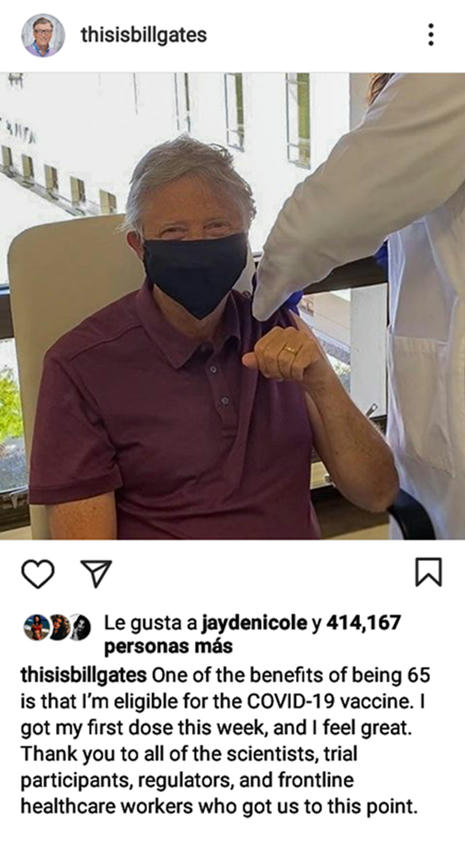 Gates publicó en Twitter e Instagram, una foto en la que se le aprecia con barbijo o tapabocas, mientras es inoculado con la vacuna de ARN mensajero (ARNm). En ese entonces, el fundador de Microsoft escribió: “Uno de los beneficios de tener 65 años es que soy elegible para la vacuna COVID-19. Recibí mi primera dosis esta semana y me siento genial. Gracias a todos los científicos, participantes de ensayos, reguladores y trabajadores de la salud de primera línea que nos llevaron a este punto.”