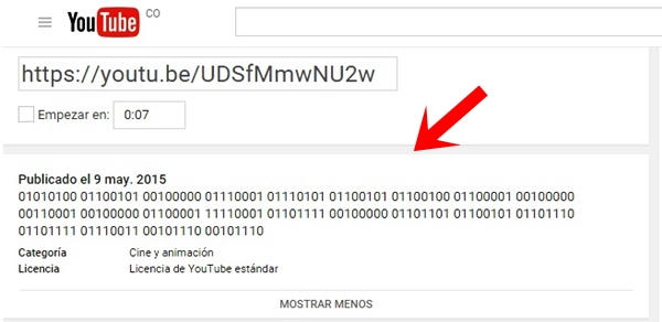 Ahora bien, el siguiente bloque de códigos binarios que se encuentra como comentario al video subido a YouTube, no es menos tranquilizador. La secuencia de códigos binarios es: 01010100 01100101 00100000 01110001 01110101 01100101 01100100 01100001 00100000 00110001 00100000 01100001 11110001 01101111 00100000 01101101 01100101 01101110 01101111 01110011 00101110 00101110.
