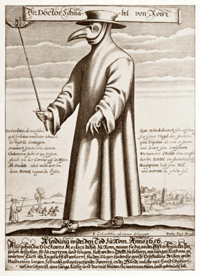 En ese entonces se creía que la enfermedad era producida por miasmas u olores fétidos, por lo que los médicos se acercaban a los contagiados con la Peste Negra, cubriendo sus rostros con máscaras y vestimentas que eran descritas así: “La nariz era de medio pie de longitud, con la forma de un pico, rellena de perfume con sólo dos agujeros, uno en cada lado, próximos a los orificios nasales, pero que bastaban para respirar, cargando con el aire que uno inhalaba, la impresión de las drogas contenidas en el extremo del pico. Bajo el abrigo vestimos botas hechas de cuero marroquí (cuero de cabra), pantalones de piel fina que están amarrados desde el frente a dichas botas y una blusa de piel fina y manga corta, cuyo extremo inferior se introduce en los pantalones. El sombrero y los guantes también están hechos de la misma piel... con lentes sobre los ojos”.