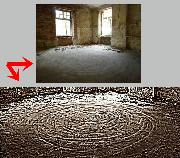Un dato, tal vez irrelevante es que uno observa en el piso de la habitación donde se grabó el video, una serie de líneas concéntricas dibujadas en el polvo. Claro que no hay claridad sobre la fecha en que se tomaron las fotos del sanatorio para saber si fueron anteriores o posteriores al video.