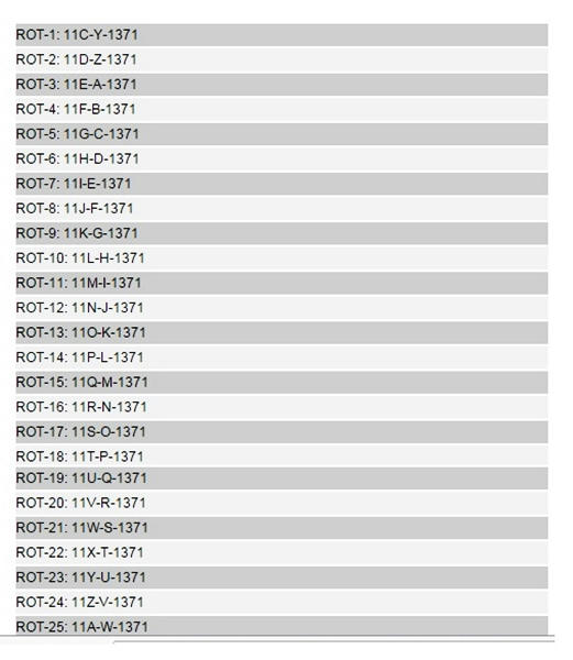 Ahora bien, cuando tratamos de desencriptar el código 11B-X-1371, usamos el cifrado César, también conocido como cifrado por desplazamiento, código de César o desplazamiento de César, una de las técnicas de cifrado más simples y usadas, el resultado fue una larga lista de códigos: