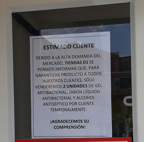 La oleada de compras fue tan caótica y masiva que supermercados de cadena como D1 debieron racionar la venta de los productos más buscados por los compradores anunciando que solo venderán dos unidades gel antibacterial, de jabón líquido antibacterial, y alcohol antiséptico por persona.