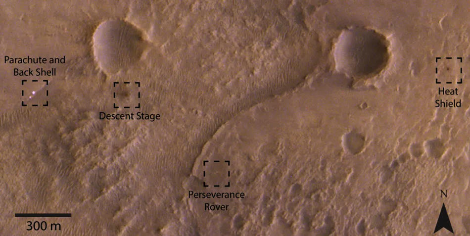 Es así como la cámara CaSSIS, del orbitador de la misión ExoMars-2016, logró captar una imagen del cráter Jezero, el sitio donde amartizó el Róver Perseverance de la NASA, el pasado 18 de febrero y en la cual se aprecian el paracaídas y la carcasa trasera del Perseverance, la unidad de descenso, el escudo térmico y, por supuesto, el propio vehículo Róver.