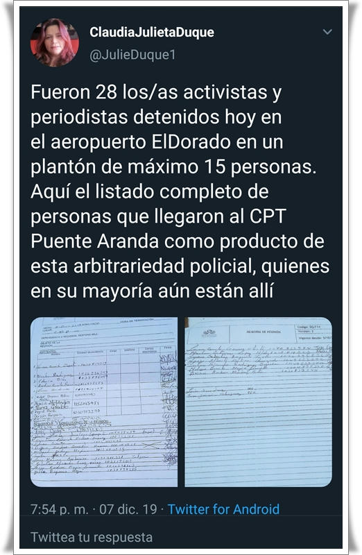 Esa explicación es burda y grosera por cuanto la Constitución colombiana consagra el derecho de opinión y de expresión para todas las personas lo cual incluye expresarse a través de las Redes Sociales, pero además de esto el Código Nacional de Policía permite a toda persona grabar los operativos policiales. Como si fuera poco el comandante de Policía del Aeropuerto El Dorado, el teniente coronel Wilson Silva, dijo al diario El Tiempo, que la detención de las activistas, en su mayoría mujeres y entre las que se encontraban dos profesoras de la Universidad El Rosario, se debió a que algunas de estas personas tenían caretas, pasamontañas y máscaras antigases. “Pretendían un plantón o especie de bloqueo”, de lo cual no hay evidencia en los videos tomados en el lugar y subidos a Redes Sociales.