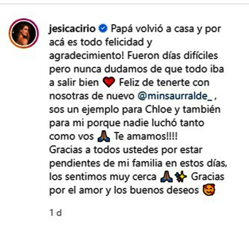 Jesica Cirio, la co-conductora del querido programa de Telefe “La peña de Morfi” compartió ayer un posteo con fotos de su hija Chloe, feliz por el regreso de su padre: " Papá volvió a casa y por acá es todo felicidad y agradecimiento. Fueron días difíciles, pero nunca dudamos de que todo iba a salir bien. Feliz de tenerte con nosotras de nuevo", escribió la bonaerense.