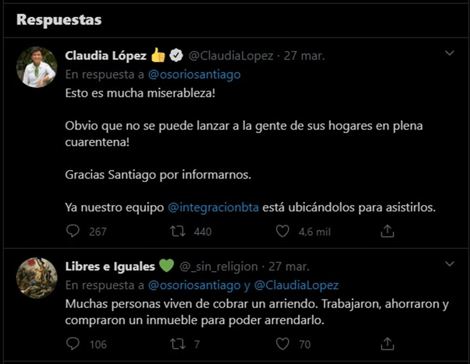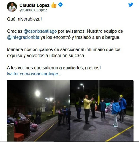 Claudia López, no tardó en responder el post de la denuncia indicando también su repudio a la situación y ofreciendo una rápida intervención en defensa de los derechos de las dos personas mayores y la niña afectadas: “Gracias @osoriosantiago por avisarnos. Nuestro equipo de @integracionbta ya los encontró y trasladó a un albergue. Mañana nos ocupamos de sancionar al inhumano que los expulsó y volverlos a ubicar en su casa. ¡A los vecinos que salieron a auxiliarlos, gracias!”.