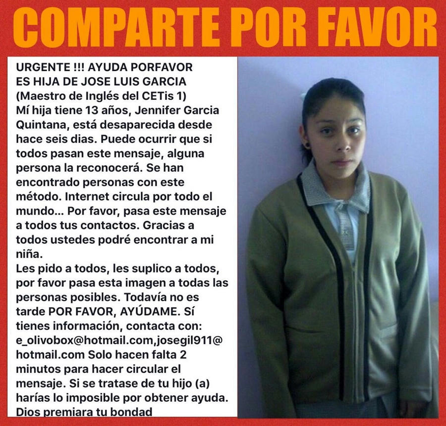 Hasta nosotros ha llegado una serie de mensajes vía WhatsApp, que refieren la desaparición de una niña de 13 años llamada Jennifer García Quintana, quien se extravió “hace seis días”, siendo hija de “José Luis García, maestro de inglés del CETis 1”.