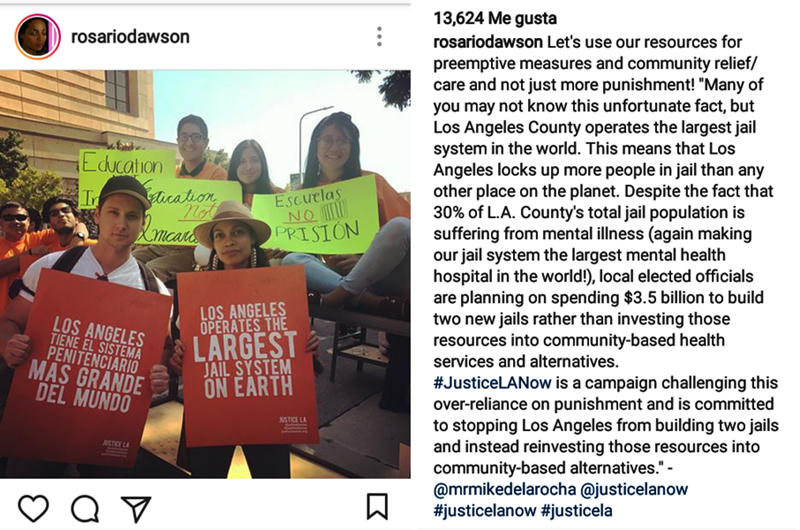Pero Rosario, es un espíritu libre y contestario y eso la ha llevado a participar en diversas protestas destacándose como una comprometida activista social, así no solo se unió a la campaña California es Mi Hogar (#CAisMyHome), una campaña audiovisual dirigida a cinco congresistas republicanos del estado para recabar su apoyo al proyecto de ley Dream Act 2017, defendiendo así a los “Soñadores”, sino que es una de las grandes detractoras de Donald Trump.