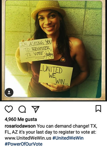 Dawson además es co-fundadora de la organización Voto Latino, y brindó su decidido apoyo al precandidato demócrata Bernie Sanders en la contienda por la Presidencia de los Estados Unidos.