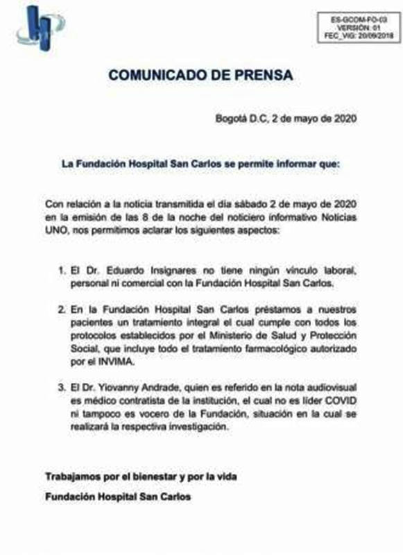 Por su parte el Hospital San Carlos de Bogotá, informó que el médico Giovanny Andrade fue retirado de sus funciones, tras confirmarse que le suministró dióxido de cloro a pacientes con Covid-19 que se encontraban internados en el hospital. El nosocomio señaló que “Según las averiguaciones, el Dr. Andrade les suministró a tres pacientes que están en buenas condiciones. Estos pacientes fueron del hospital San Carlos y fueron atendidos por nosotros adheridos a los protocolos que tiene establecida la institución para el manejo del Covid-19, que en ningún momento incluyen la prescripción u orden de este producto”, explicó la presidenta de la junta directiva del hospital San Carlos, Anabell Arbeláez en entrevista con Radio Nacional de Colombia.
