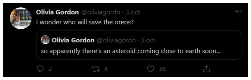 Ahora bien, todo este asunto del bunker de Oreo empezó como la respuesta que dieron en Nabisco a un tweet casual de Olivia Gordon, una fan de las galletas de chocolate, y que ella publicó el pasado sábado 3 de octubre en su cuenta de Twitter. La pregunta de Olivia Gordon fue la chispa de inicio del proyecto de Oreo: “Si el asteroide del día de las elecciones llega a la tierra, ¿quién salvará las Oreos?”