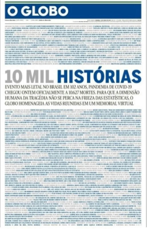 The New York Times, sigue así el ejemplo del diario O Globo, el cual el domingo 10 de mayo publicó una tapa con los nombres de 10 mil de las víctimas del virus en Brasil.