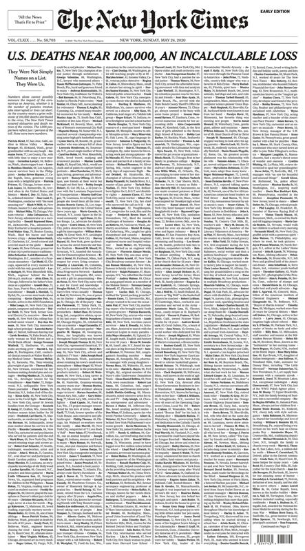 The New York Times, escogió para su portada de hoy domingo, publicar los nombres de algunas de las 98, 683 víctimas que el Covid-19 ha dejado en los Estados Unidos.
