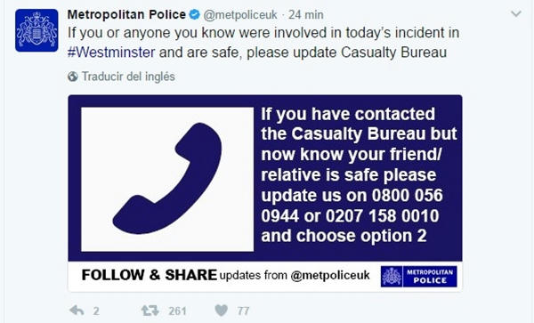 La policía de Londres ha estado pidiendo por Twitter, a la ciudadanía que les envíen fotos de lo ocurrido, aunque se ha hecho un llamado a no compartir en las Redes Sociales, imágenes demasiado fuertes, por cuanto hay escenas muy sensibles. La policía también está instando a aportar cualquier dato que permita aclarar mejor lo ocurrido.