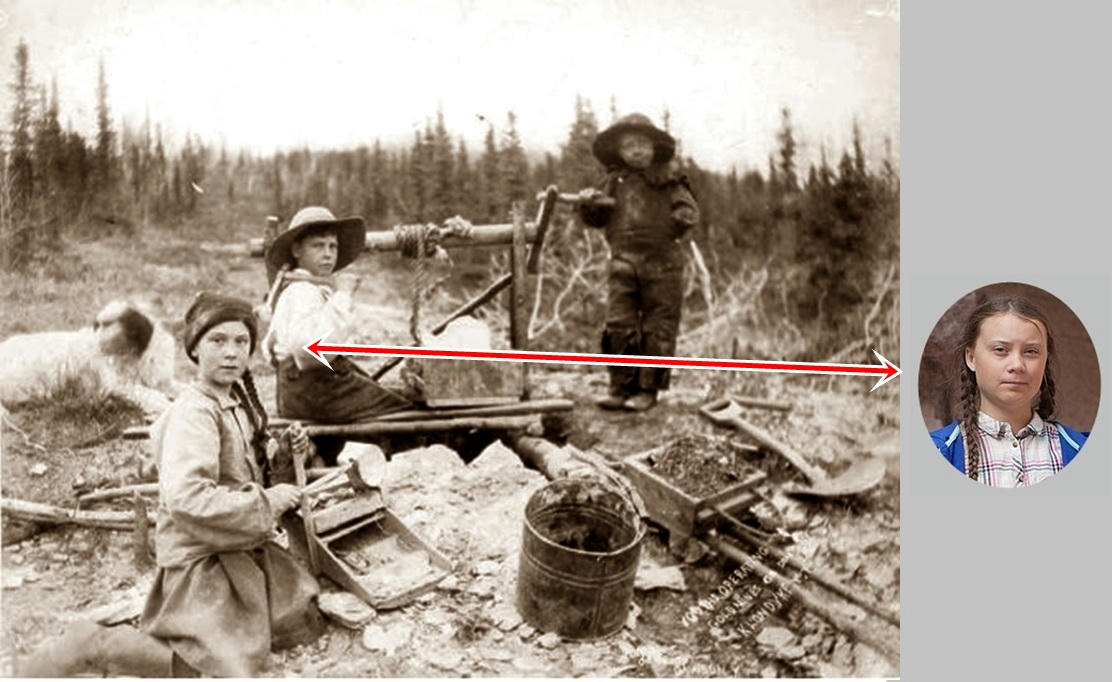 Greta nació en Estocolmo, el 3 de enero de 2003 y la foto de los niños aguateros fue tomada en 1898 en el territorio de Yukón, en Canadá, por lo tanto, es apenas obvio que pese al parecido es imposible que se trate de la misma persona.