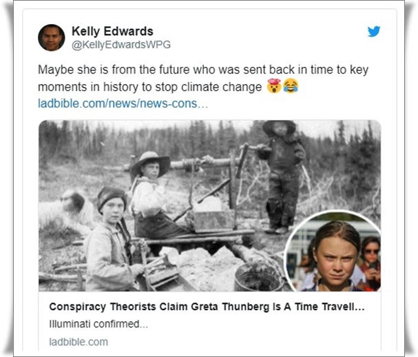 Pese a esto, los amantes de las teorías conspiratorias sostienen que Greta Thunberg es una agente enviada del futuro a través del tiempo y que viaja a épocas críticas de la historia humana para evitar el desastre planetario. La teoría no explica porque la genial Greta estaba presente en la fiebre del oro de Klondike en 1898, pese a las obvias implicaciones que para el medio ambiente tuvo ese episodio.