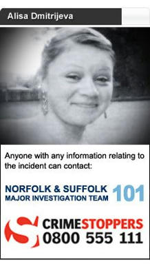 En el primer caso, el de la joven Alisa Dmitrijeva, se trata de una adolescente letona que desapareció en Norfolk después de la medianoche del 31 de agosto en Friars Street, poblado de Kings Lynn, antiguo puerto y mercado inglés, ubicado a 97 millas -156 km- al norte de Londres y 44 millas -71 kilómetros- al oeste de Norwich, y próximo a los Bosques de Anmer, en Sandringham Estate, donde fue encontrado el cadáver de la mujer desconocida. Su desaparición fue reportada a las autoridades el 06 de septiembre de 2011, por familiares de la joven.