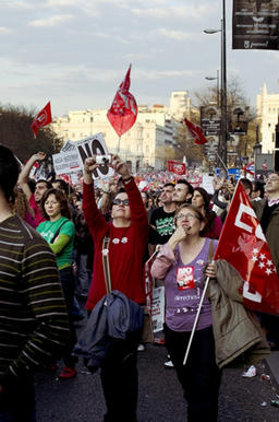 Al final de la marcha en la capital ibera, el secretario de CC.OO, de Madrid fue el primero en intervenir desde la Puerta del sol, diciendo «Hemos hecho una huelga como la copa de un pino. No quisieron atender a las señales más que suficientes que recibieron desde que el Consejo de Ministros decidió aprobar el Real Decreto de la Reforma Laboral. La reforma que más va a deteriorar nuestro sistema laboral sin aportar soluciones», los manifestantes corearon "Así, así. Ni un paso atrás con la reforma. Huelga general", muchos de ellos exhibían pegatinas con la leyenda "No a la reforma laboral del despido barato".