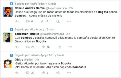 Diferentes reacciones se dieron a través de Twitter tras conocerse de los atentados terroristas de ayer en Bogotá, algunos recordaron los falsos positivos que ocurrieron durante la época de la campaña reeleccionista del líder de la ultraderecha radical el ex Presidente Álvaro Uribe Vélez, otros aprovecharon la oportunidad para reanudar los ataques contra el Alcalde de la capital, el izquierdista Gustavo Petro y para atacar con ferocidad el proceso de paz de la Habana y al gobierno de Juan Manuel Santos Calderón.