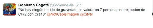 A través de la cuenta oficial de la Alcaldía Mayor de Bogotá, se dieron los partes iniciales sobre lo ocurrido en la Avenida Chile y Puente Aranda: “No hay ningún herido de gravedad. Se valoraron 7 personas en explosión de Calle 72 con Carrera 10ª”. Foto captura de pantalla desde Twitter.