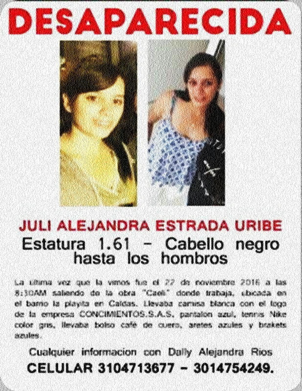 “Juli Alejandra Estrada Uribe, tiene 22 años, mide 1,61 cms, tiene caballo negro hasta los hombros, aretes y brackets azules, vestía camiseta blanca con el logo de la empresa “CONOCIMIENTOS SAS”, pantalón azul, tenis grises marca “NIKE”, y llevaba un bolso café de cuero al momento de su desaparición ocurrida el martes 22 de noviembre a las 8:30 de la mañana, cuando salía de la construcción “Caolí”, donde trabajaba en el sector de La Playita, municipio de Caldas, Antioquia, Colombia. Cualquier información comunicarse con DALLY ALEJANDRA RÍOS, al Celular 3104713677 - 3014754249”