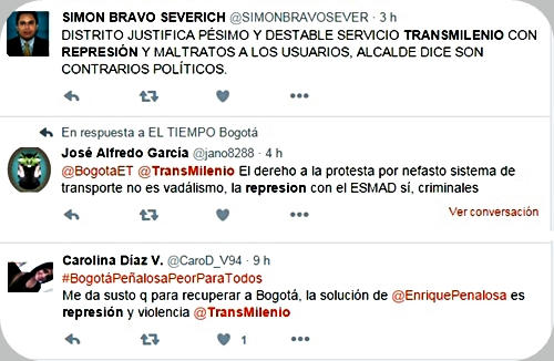 Aunque la protesta empezó por el retraso y el mal servicio de Transmilenio, pronto derivó en grupos de iracundas personas que gritaban “Fuera Peñalosa!, Fuera Peñalosa!”, e incluso un equipo de reporteros del polémico canal televisivo RCN, propiedad del multimillonario Carlos Ardila Lulle, fue objeto de agresiones con naranjas y tomates.