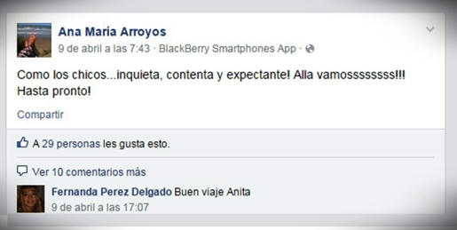 Una vibrante Ana María, que gozaba de los días de sol, las playas, la mar y las vacaciones, comentó en su Facebook el 09 de abril, antes de iniciar su viaje de ensueño por el Caribe, hacia Estados Unidos: “Como los chicos… inquieta, contenta y expectante. Allá vamossssss!!! Hasta pronto!”.
