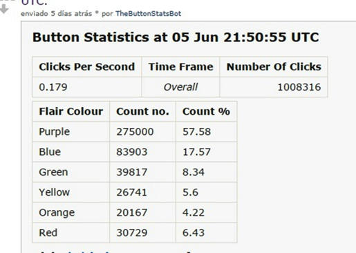 Bogotá D.C., Junio 11 de 2015. Sala de Redacción de ACCIÓN 13 Noticias. El pasado viernes 05 de junio llegó a su fin un misterioso y extraño juego en Internet que apasionó por dos meses a los usuarios de la Red Social y de noticias Reddit, quienes debatieron sobre la finalidad de un contador de 60 segundos que se reiniciaba cada vez que alguien, en cualquier lugar del mundo, apretaba el botón, lo cual en la práctica hicieron 1008316 de personas hasta que el contador se detuvo y el botón dejó de funcionar.