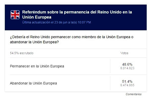 Cuando aún faltaban varios territorios por escrutar, los resultados eran del 51.1 % (10.002.965), por el Leave, y 48.9% (9.6664.072), por el Remain, resultado volátil que podría variar en cualquier sentido en el transcurso de la mañana.