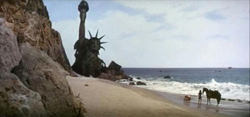 Después de muchas aventuras y desventuras, un Coronel George Taylor, (Charlton Heston), prepotente y displicente hacia los simios por provenir de una orgullosa civilización humana, huye con una bellísima humana salvaje, Nova, muy sensual con su traje primitivo, (Linda Harrison). Montados en un caballo recorren la alienígena playa, mientras Taylor piensa en cómo regresar a su Tierra, cuando encuentra semienterrada y derruida una vieja estatua… La Estatua de la Libertad.