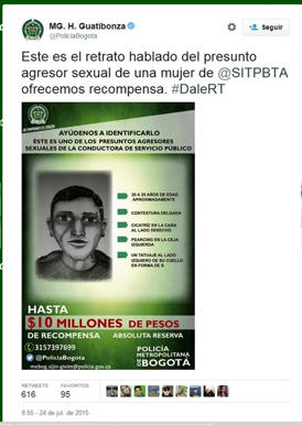 El Coronel José Luis Barrera Jurado, oficial de Inspección de la Policía Metropolitana de Bogotá, contó a los medios locales que “Gracias a las descripción y colaboración de la valiente mujer quien fue víctima de un aberrante caso de violación, se difundirá en las próximas horas los [otros] retratos hablados de los agresores”, el oficial señaló también que "Nos solidarizamos con la mujer. Ella recibirá todo el acompañamiento de un equipo especial de trabajo que ha creado la Policía Metropolitana de Bogotá para lograr establecer los hechos".