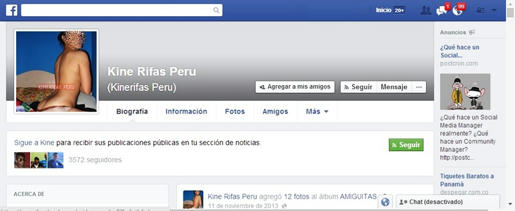 En cambio encontramos nuevamente el grupo denominado “Kinerifas Perú”, un grupo dedicado a rifar sexo con adolescentes en Perú y que ya habíamos denunciado en una nota publicada en julio de 2013 y que, obviamente tiene un contenido ilegal relacionado con la explotación sexual, la pedofilia y tal vez la trata de personas.