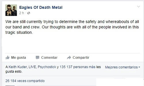En su fan page de Facebook, la banda Eagles of Death Metal, informó a sus seguidores que se encontraban tratando de establecer su situación y la de su equipo de colaboradores tras el brutal ataque. Hay incertidumbre por la suerte de los músicos californianos.