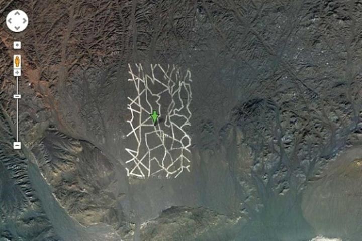 Se trata de una serie de fotografías tomadas desde el espacio exterior por los satélites de Google Maps y que muestran un área en la frontera de las provincias de Gansu (甘肃) y Xinjiang, (新疆), en China, en el desierto del Gobi, al Oeste del país.