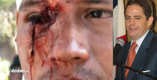 Un campesino que protestaba contra el proyecto de la Represa de El Quimbo, muestra sus heridas sufridas durante el violento desalojo del que fueron víctimas campesinos e indígenas por parte de la Policía de Colombia, a la cámara de “El video que el gobierno no quiere que veamos”. A la izquierda el Ministro Germán Vargas Lleras, “consentido” del Presidente Santos. (Fotos captura de Internet y Wikipedia).