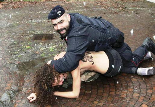 Un policía italiano arresta con bastante rudeza a una de las activistas de FEMEN, que protestaron ayer en Milan, contra el magnate de las comunicaciones y líder derechista Silvio Berlusconi, (Foto tomada de https://femen.org/).