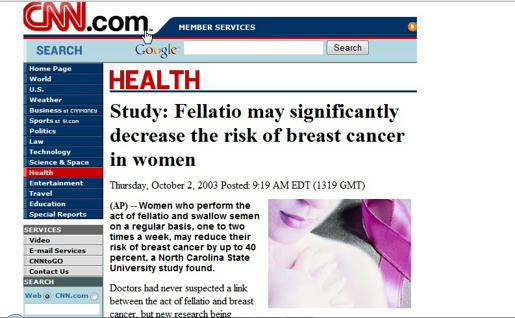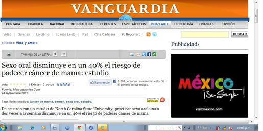 Bogotá D.C., diciembre 15 de 2012. Sala de Redacción. El afán por “cazar” noticias parece haber cobrado una víctima más en el periódico mexicano Vanguardia, que publicó en su edición digital una curiosa nota cuya fuente seria otro diario azteca, Metronoticias.Com, de Tamaulipas. La nota titulada “Sexo oral disminuye en un 40% el riesgo de padecer cáncer de mama: estudio”, sería realmente un “faked”, es decir, una nota falsa publicada inicialmente en el año 2003, con un formato “clonado” de la CNN, y es una broma que ha sido reproducida desde entonces por varios bloguistas.