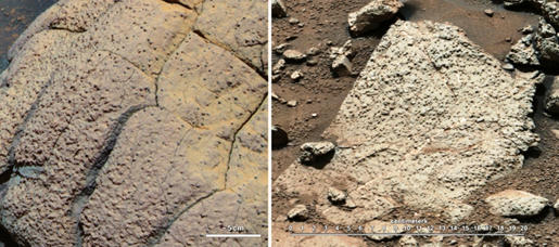 La NASA, señaló que “Este conjunto de imágenes compara rocas vistas por Opportunity de la NASA y el rover Curiosity en dos partes diferentes de Marte. A la izquierda está "Wopmay" roca en el cráter Endurance, Meridiani Planum, ya estudiado por el rover Opportunity. A la derecha están las rocas de la "Sheepbed" unidad en Yellowknife Bay, en el cráter Gale, como se ve por el Curiosity”. Crédito de la imagen: NASA / JPL-Caltech / Cornell / MSSS.
