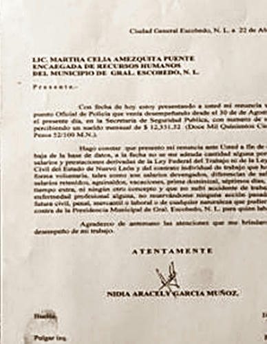 Luego se sabría que la joven presentó renuncia a su cargo de policía en la Proxpol (Policía de Proximidad) de Escobedo, cuerpo al que pertenecía desde 2013 y a la fecha tenía un sueldo de un poco más de 12,500 pesos mensuales.
