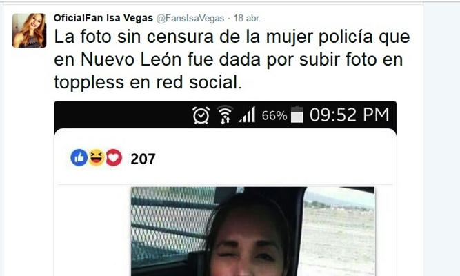 Pero nada parece apaciguar ese “linchamiento” público al que está siendo sometida. Los titulares de algunos medios resultan claramente sexistas “Por andarse tomando fotos topless, policía de NL es suspendida”, rotuló https://www.sopitas.com/, por ejemplo, mientras que en las Redes Sociales y foros se multiplicaban los comentarios subidos de tono haciendo referencia a la anatomía de la ahora ex mujer policía.