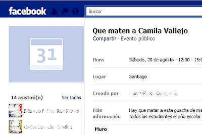 En medio de los sucesos vividos en Chile en estos últimos meses, un grupo en Facebook, amenazó de muerte a la joven líder del movimiento estudiantil, Camila Vallejo Dowling. Recientemente una serie de mensajes insultantes y de amenazas que recibió Camila, por parte de un usuario de Twitter, despertaron indignación.