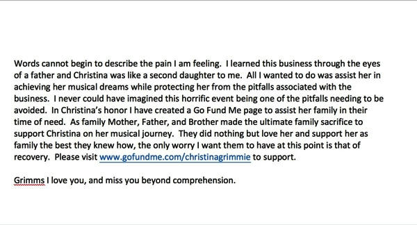 Su hermano Marcus publicó cinco fotos de Christina en Facebook y escribió "Christina era más que mi hermana", y agregó "Era mi pareja en la vida. Un súper estrella. Una boba. Introvertida. Y una amiga de todos. Genuina. Pero sobre todo... ella era mi hermana pequeña. Ella amaba al Señor y su familia y siempre estaba allí para mí y sinceramente, no sé qué haré sin ella."
