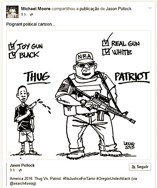 A la derecha, el brasilero dibuja a uno de los milicianos de Oregón, armado hasta los dientes y escribe: “Arma verdadera” + “Blanco” = “Patriota”, haciendo referencia a la laxitud con que las autoridades federales han tratado el caso de la ocupación de la reserva natural a contracara del exceso de fuerza que se usó contra el niño de 12 años con la pistola de juguete.