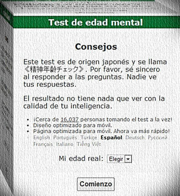 Se encuentra disponible en el link https://www.mbti123.com/mental/es/, y te hace preguntas como: “Soy una persona realista y directa”, “No quiero pensar en cosas complicadas”, o “Tengo un alto nivel de tolerancia” y aunque se auto atribuye a creativos japoneses no es claro que realmente haya sido así y resulta más probable que sus creadores sean españoles o argentinos. Se trata de un supuesto Test que ofrece medir tu “Edad Mental”, es decir, el nivel intelectual relacionado con la edad cronológica, algo que inicialmente fue diseñado para medirse en niños, y que simplemente significa que “un niño que rinda con tanta eficacia como el niño medio de 8 años, tiene una edad mental de ocho", (Myers D., Psicología, Madrid, Editorial Médica Panamericana, 3ra. edición, pág 319).
