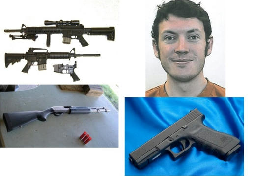 James Eagan Holmes, usó un rifle de asalto, una escopeta y dos pistolas semiautomáticas para sembrar la muerte en la sala 9 del teatro Century 16 de un centro comercial en Aurora, Colorado.